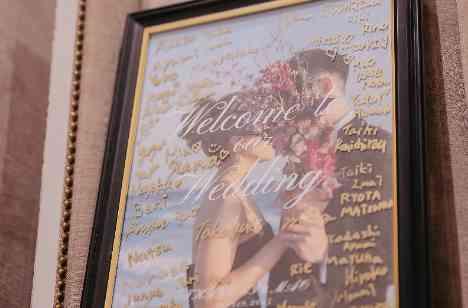 素敵なお二人の前撮りのお写真が入ったフォトボード。 ご来館いただいた皆様にボードにサインをいただき、ゲストの皆様と作り上げたウエディングボードが完成しました☆完成したボードは会場に飾り、皆様にもお披露目♪ 皆様からの祝福の想いが込められたボードは、素敵な一生の思い出のアイテムとなりました・・・♡