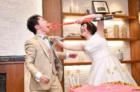 よりアメリカンな雰囲気を出したい!!ということでケーキも細部までこだわったおふたり☆ マーブルチョコレートやポップコーンで可愛らしく、クリームの色でより華やかに♪ ファーストバイトも大好きな映画をモチーフにしたお手製スプーンで・・・♥