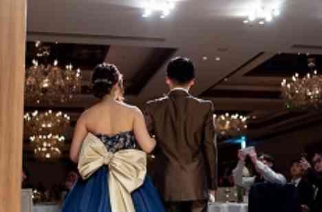 和装姿から雰囲気をがらりと変えて新郎様はタキシード、新婦様はカラードレスに。 大きなバックリボンが特徴的なネイビーのカラードレスとブラウンのタキシードをおめしにな 皆様からのお召しになり、ゲスト様からのたくさんの歓声に包まれながら、ご披露宴会場へ再入場されました♡