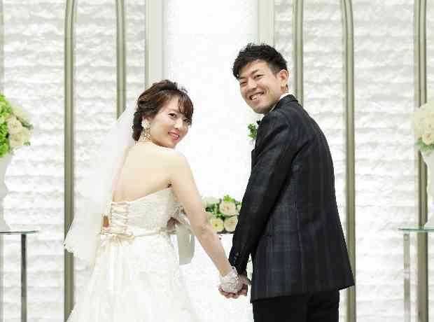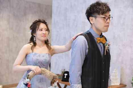 純白ウェディングドレスから爽やかな雰囲気にかえて♪カラードレスを新郎様に内緒にしていた新婦様。入場前にファーストミートを行いました。新婦様のお姿を見て幸せそうな新郎様。お二人のご結婚式のイメージにぴったりのカジュアルスタイルに♪お二人ともとてもお似合いです。ゲスト様からのたくさんの歓声に包まれながら、ご披露宴会場へ再入場です!