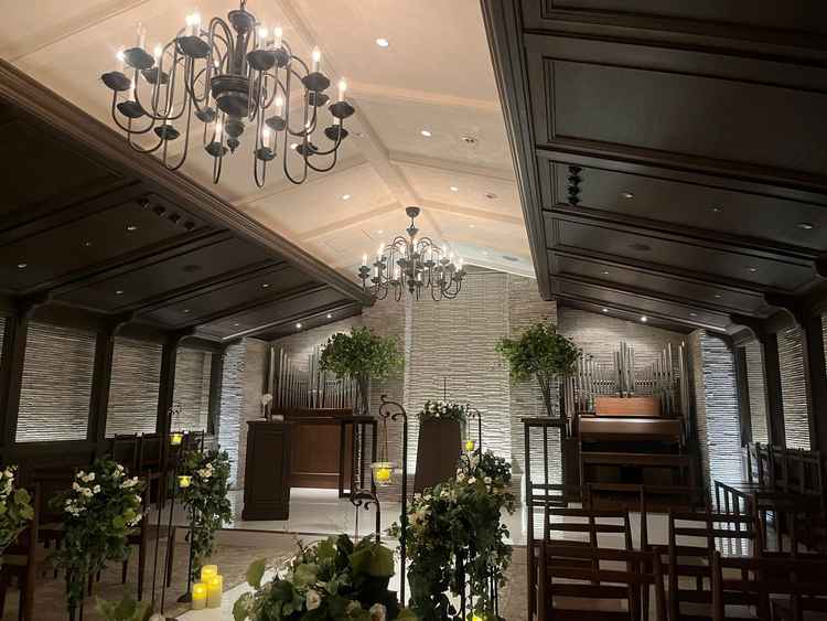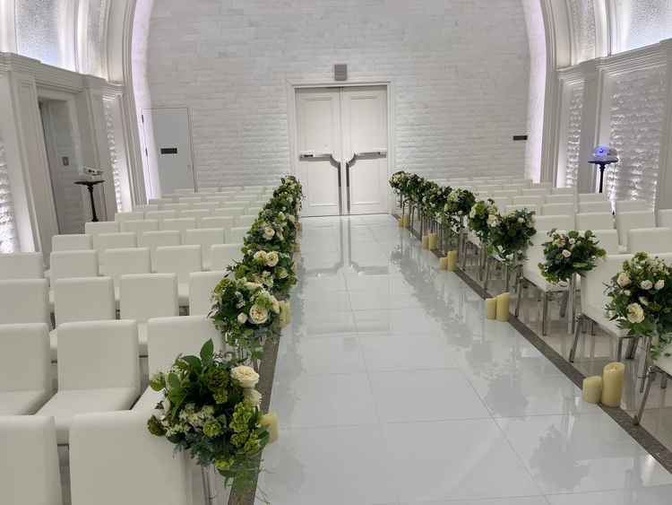 チャペルは天井が高く、一面ホワイトカラーが印象的でした。写真映えもしそうで良かった。自分達のやりたいイメージにピッタリだった。