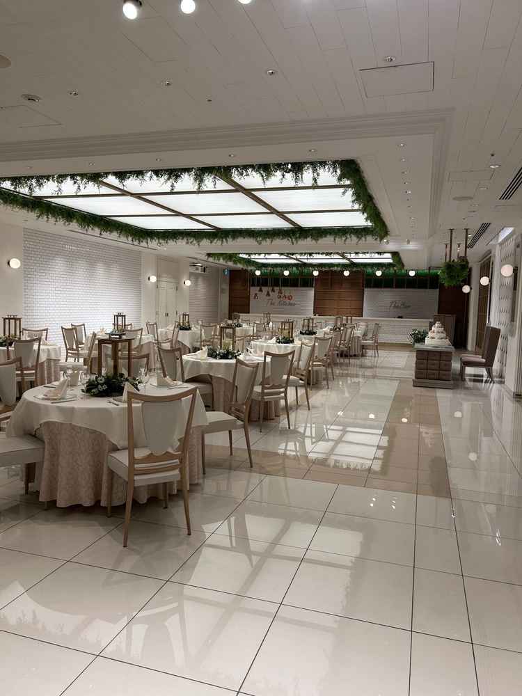 白を基調としていて素敵でした。 テーブルクロスや装花によってどんな雰囲気にもなる素敵な会場だと思いました。