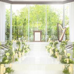 【木々と緑の光溢れるチャペル入場体験】神戸北野の緑を眺めながら、優しい自然光の温もりを感じるチャペルにて挙式入場を体験♪バージンロードは当会場ならではのランウェイスタイルで、ゲストのお顔がよく見えます