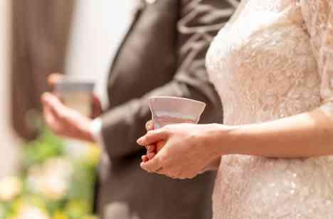 ゲストのお席に置いてあるのはお名前が書かれた木箱 司会者からの合図で一斉にオープン! 中に入っているのは陶芸家が心を込めて手作りをした 一点物の湯のみ 一人一人のお名前から色や形をイメージしてお作りした世界にたった一つの贈り物です 和やかな雰囲気に包まれる中 おふたりの乾杯のご発声でご披露宴がスタート オリジナルの湯のみに乾杯酒を注ぎ乾杯!