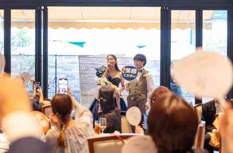 ガーデンからサプライズお色直し入場されたおふたり! 歌がお上手なご新婦様はドレスの色当てクイズの結果発表もあわせて「♪青い珊瑚礁」を歌いながら青いドレスでご入場されました お隣のご新郎様もノリノリのご様子♪ おふたりが一生懸命作成したうちわを持ちながら会場はまるでライブ会場のような盛り上がりに!