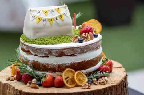 ウェディングケーキはなんと キャンプのテントをイメージした可愛らしいデザイン♡ 土台に丸太を使用し、さらにキャンプらしさがup! おふたりオリジナルの斬新なデザインにゲストも興味津々のご様子でした 緑豊かな自然あふれるガーデンでゲストに見守られながらケーキ入刀♡ おふたりの素敵な笑顔がまぶしい一枚です