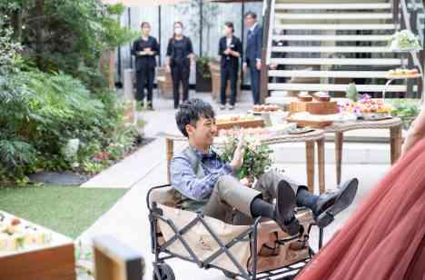 お二人の再入場はなんと!? ゲストからの「わー!」という歓声に包まれながら、 お二人が愛用のキャンプワゴンに乗ってご登場!! 満面の笑みでご入場されたおふたり そしてガーデンにはたくさんのデザートが! おふたりならではのアレンジでキャンプ感満載のマシュマロをご用意 実際のキャンプさながらマシュマロを串にさして焼きマシュマロにしました♪