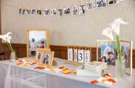 挙式は教会式で厳かに。ご披露宴は思いきり楽しむ!をテーマに。笑顔いっぱいのウェディングパーティーにするため、どんなにおいそがしい中でも、いつも明るくご準備を進めてこられたおふたり。挙式後はゲストひとりひとりに宛てたメッセージでお出迎え。思い出のお写真に添えられた心のこもったメッセージを読み、皆様つい笑顔がこぼれます。