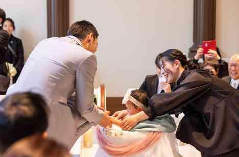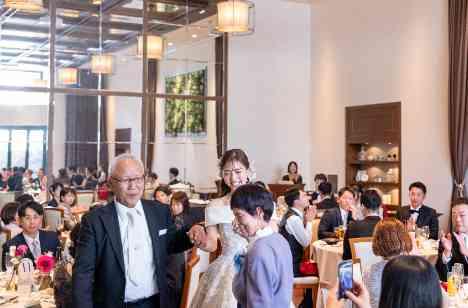挙式後のお肉トスで大盛り上がりの後はパーティーがスタート!ご入場の瞬間から会場が一体となり、乾杯・ケーキセレモニーのひとつひとつの瞬間でとても和やかなお時間が流れました。ご中座のエスコートはそれぞれ、おじい様、おばあ様、ご兄妹と手を取り合ってのご退場。ご一緒にエスコートをされたご本人だけでなく、ご両親にとっても心があたたかくなる、そんな瞬間でした。