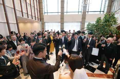 披露宴までのお時間には、ウェルカムパーティーを実施。 「披露宴が始まるまでにも一度全員で乾杯をしたい!」というお二人のご希望から、 この日1回目の「乾杯!」が行われました。 お写真を撮ったり、 久しぶりの再会を喜びあったりと、 終始和やかな雰囲気の中、 リラックスした時間が流れていきます。