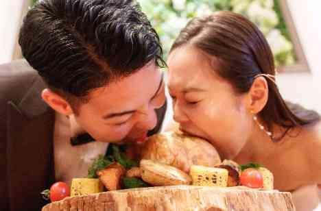 本日2回目の「乾杯!」のあとはゲストとの歓談タイムへ。 そんな中登場したのは、通常のウェディングケーキ…ではなく、特大サイズのローストチキン! クリスマスらしさにこだわったおふたりならではの特別な演出です。 ケーキ入刀の代わりに、おふたりで豪快に‶がぶりっ″ 会場には驚きと笑いが広がり、一気に盛り上がります。 さらに〝ありがとう″の気持ちをこめて、ご友人へのミートバイトも行いました。
