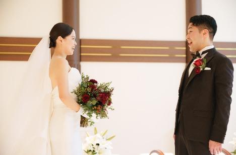 お支度が整ったおふたりは、ファーストミートへ。 対面の瞬間にあふれた笑顔と少しの緊張感が、特別な一日の始まりを感じさせます。 ゲストの皆様が集まり、いざ挙式。 挙式はキリスト教式で厳かに執り行われました。 たくさんの祝福に 包まれながら、永遠の愛を誓うおふたりの姿は とても美しく、心に残る感動的なシーンとなりました。