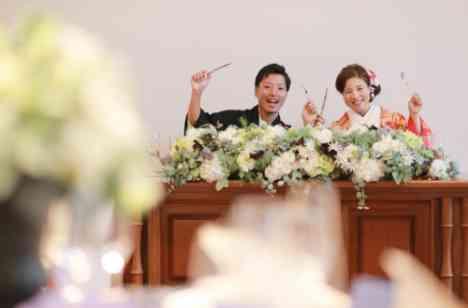 楽しいことが大好きなお二人は「パラシュートベア」でお福分け!!司会者のコメントで新郎新婦がバズーカーを発射すると、パラシュートをつけた可愛いくまちゃんが、ゆっくりとゲストの元へ舞い降りました。気付けば大人も子供も、男性も女性も、ゆらゆら降りてくるくまちゃんに魅了され、懸命に手を伸ばしていました。そんな光景に新郎新婦も思わず笑顔!!誰もが気軽に参加できる、楽しい演出となりました!!