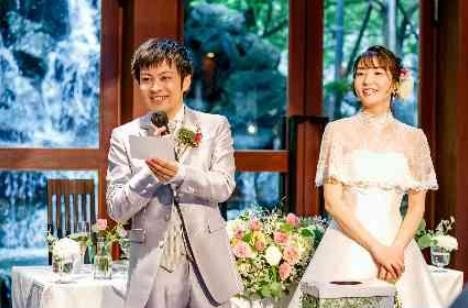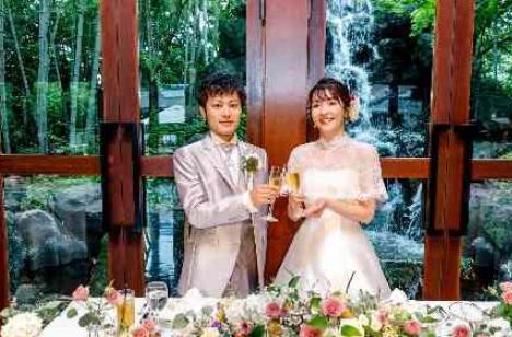 披露宴会場から見える「滝」はゲストから、とても好評でした!普段はなかなか体験できない、滝を見ながらの食事は「最高のおもてなし」になったかと思います。 また、新郎新婦の後ろに滝があるので、写真映えもバッチリでした。そして、高砂からゲストとの席も近く目線も同じ高さなので、とてもアットホームな披露宴になりました。