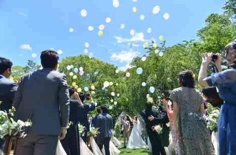 当日は幸い天気にも恵まれ、ガーデンに椅子を出して人前式を行いました。木が風に揺れる音がとても神聖で、一生思い出に残る挙式となりました。そのあとのオープニングパーティーもバルーンリリース、スパークリングワインでの乾杯、披露宴始めの始球式などガーデンを生かした演出にしました。ゲストとの距離も近く、アットホームで楽しい時間になり、披露宴会場に移るときに名残惜しくさえありました。