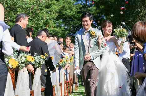 ガーデンウェディングならではの、列席者の皆様のラフな雰囲気や、温かい歓声がとても嬉しかったです!私たちもそれほど緊張することなく、私たちらしい明るい挙式となりました!夏の暑い日の挙式で皆様には申し訳なかったですが、式場の方で暑さ対策なども考えてくださっており、特に問題なく執り行うことができました!そして、青い空、きれいな緑の芝生にひまわり、私たちにとって最高のロケーションでした!