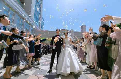 挙式は教会式で厳かに、そしてご家族への感謝を込めて温かい時間に。シーンの切り替えとしておふたりが選んだ1stセレモニーは、120名のゲストと一斉に行うフラワーシャワー!結婚式日和な青空のもと、白い花が舞う写真もフォトジェニックでこれから始まる披露宴に向けてゲストのテンションも自然と上がっていきました!