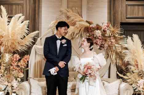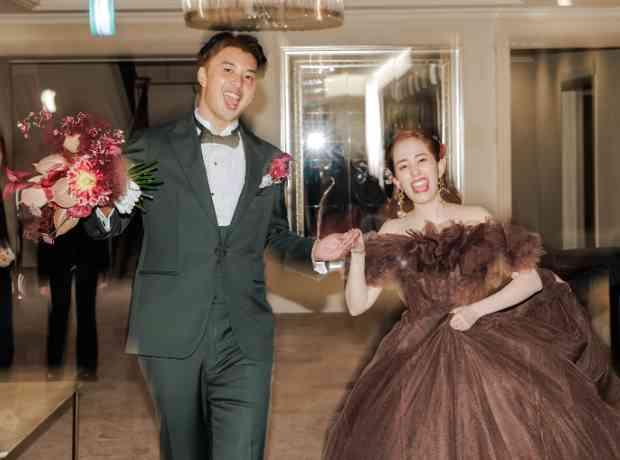 ご自身にお似合いになるドレスをスタイリストと一緒にお選びいただきました。 ウェディングドレスもカラードレスもゲストの方々にとても好評でした。 髪飾りもおふたりのテーマの秋っぽいお花を使用して、カラードレスのお色味と合わせました。 ご新郎様も挙式はブラック、お色直し後はカーキのタキシードをご着用いただきました。