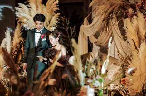 パンパスをベースとした豪華なソファメイン 秋をイメージしており、会場に入った瞬間にゲストが目を引く豪華なソファメインを作り、会場に入った瞬間から、おしゃれ!!とお声が飛び交いました。 会場のレイアウトも工夫し、どこのゲストから見てもおふたりが目立つように、そしてソファメインにすることでおふたりのご希望とされている【ゲストとの距離が近い】ウェディングをご提案いたしました。
