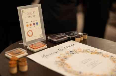 ここでもお花をモチーフとした結婚証明書をご準備! 受付でゲストの皆様にスタンプでリースを作成していただき、お二人らしく素敵な1枚に。 ご結婚式後はご自宅に飾っていただけるようなデザインでゲスト様からもご好評でした。 ゲスト参加型の演出は、一人一人と繋がれる、そして物としても心にも残りとても人気です!