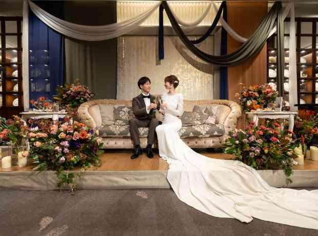 解放感あふれるウエストスイートでクロス×お花をたくさん使ってたくさんの方とお写真撮影♡ ゲスト皆様とのお写真がとても華やかに、そしていつどんな場面でも映り込むメインソファの装花はとても印象的で素敵にお写真が残ります♪ おふたりらしさ溢れるカラーリング、唯一無二の空間でお時間をお過ごしいただきました!