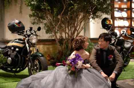 新婦様は結婚式場のフローリストさん。さまざまな結婚式をご担当されてきたからこそ、空間の使い方にはとてもこだわり、当方のフローリストとも打合せを重ねて、ゲストにも印象に残る空間を創り上げました!会場後方には、おふたりの共通のご趣味であるバイクも飾り、おふたりらしいお気に入りの空間に♪当日ゲスト様にもたくさんお写真を撮っていただけました!