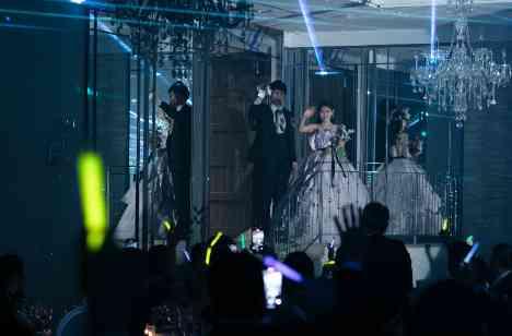 イーストスイートにしかない階段にて再入場を行いました。レーザーライティング演出をすることによってより階段からご入場されるおふたりにスポットが当たり、主役感を演出しました。ゲストの方々にはBGM当てクイズにご参加をいただきペンライトを振っていただいています。ドレス色当てクイズでももちろん盛り上がりますが、レーザーライティング演出にBGM当てクイズを組み合わせることにより大盛り上がりでした。