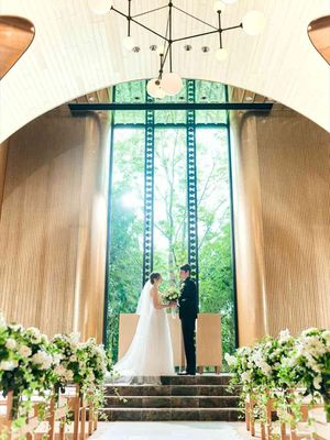 祭壇奥の大きな窓からは木々の緑がのぞき、温かな色合いの木をふんだんに使ったチャペル。初めて訪れる場所とは思えない居心地の良い空間です。