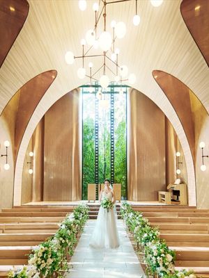 コンサートホールをイメージさせる曲線美の美しいチャペル。ナチュラル×モダンなデザインなので、どんな装花やコーディネートを選んでもしっくりなじみます。