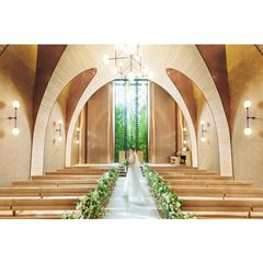 【緑×自然光×建築美!一度は見たい感動チャペル】柔らかな木の曲線がドレス姿を美しく引き立てるチャペルは、一目惚れする花嫁も多い。映像が流せるプロジェクター付だから、入場前に想いを伝える感動の挙式を
