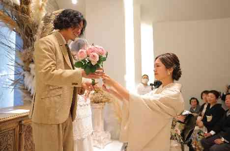 挙式の進行の中ではダーズンローズのセレモニーを取り入れました。 ドライフラワーのお花がコンセプトの会場にぴったりの演出でした。 お父様やお母様にも入場シーンは参加して頂きました。その後にはガーデンでフラワーシャワーの祝福のシーンや乾杯!ゲストの皆様もとてもリラックスして過ごして頂いた時間でした。