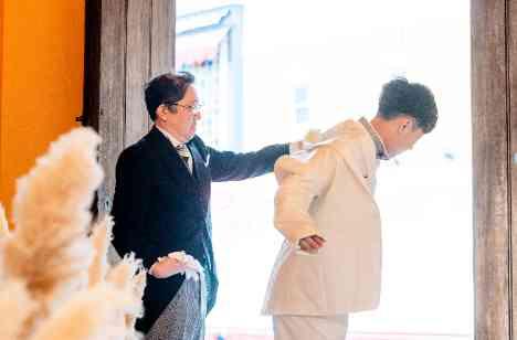 新婦様がベールダウンでお母様にお支度をしてもらうのと同じように、新郎様が入場する際にお父様にジャケットを着せてもらい、お母様からグローブを受け取るジャケットセレモニーを行いました! ご両親の為に結婚式をやりたいとおしゃっていただいていたおふたりは、親御様からの最後の身支度にこみあがるものがありました。