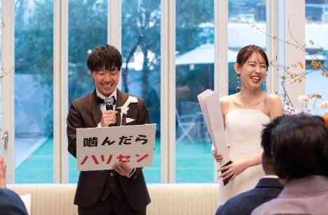 おふたりからの挨拶を代表して新郎より 噛んだら新婦からハリセンでお仕置き 緊張で沢山噛んだ新郎 会場が笑顔と笑い声で包まれ おふたりらしい披露宴のスタートです 乾杯では新婦様の甥っ子姪っ子の登場! 元気いっぱいに乾杯挨拶をしてくれました ゲストの皆様を代表して兄妹息を合わせて頑張りました