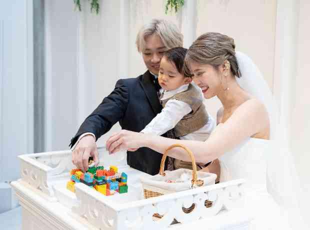 お子様ゲストも多かったので立ち歩いて楽しく過ごせるくらい ラフな雰囲気を出しながら全員が参加できるよう 結婚証明書には皆で作るレゴの演出やデザートビュッフェなども 取り入れみんなと一緒に作る一日にこだわりました 家族で新たに歩んでいく誓いを胸に 誓いのキスはおふたりの大切なお子様を真ん中にファミリーキスにしました