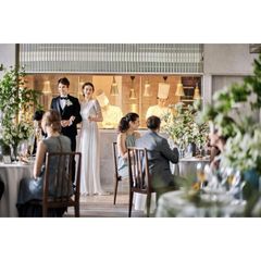 【オープンテラス付の披露宴会場】窓を全開放すると、テラスとひと続きの空間になるパーティ会場。テラスからの入場やケーキカット、スイーツビュッフェも人気!フェアで自慢の鴨川×美景ウェディングを体験!