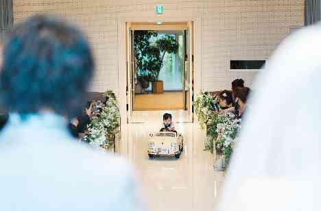 結婚式当日までドレス姿を見せずに、挙式前のファーストミートで初披露。挙式前のおふたりだけの特別なひとときは、とても感動的なひとときを過ごしました。 また、お子さまが誕生してからの結婚式だったので、一緒に参加できるようにという想いがあり、実現したのが「リングボーイ」。指輪をラジコンカーに乗せてチャペルに登場!大成功でとても盛り上がり、和んだ空気に包まれた瞬間でした。
