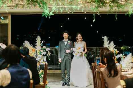 夜のテラスでセカンドミートを行い、お色直し入場! 幻想的な雰囲気のなか入場し、ゲストの皆さんと写真撮影を楽しみました。 ゲストの方からの温かいお言葉や友人からのお手紙にも嬉しさがあふれ、幸せな時間になりました。 式の雰囲気は、友人がたくさん声をかけてくれたおかげで、とてもアットホームで笑顔の溢れた式となりました。