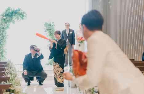 幼い頃にお父様としたキャッチボールが思い出に残っている新郎こうへいさん。ご家族対面のお時間で、これまでたいせつに育てて下さったお父様へキャッチボールを通し感謝をお伝えいただきました。最後にはお母様も加わり、新郎こうへいさんがピッチャー、お父様がキャッチャー、お母様がバッターとなりご家族にとって思い出に残る素敵なお時間になりました。