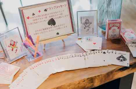 お打合せにて「トランプを使った演出をしたい」と伺い、待合室でひとり1枚トランプをお取りいただき、メッセージを書いてもらったものをボックスに集め、抽選で当たった方にプレゼントをお渡しするという演出をご提案いたしました。 披露宴後に、ゲストからのメッセージを見ておふたりも笑顔が溢れていらっしゃいました。