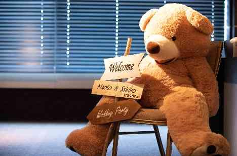 いつも周囲を明るくしてくれる笑顔が素敵なおふたり。お打ち合わせは元気いっぱいの1歳のお子様がいつも一緒でした。おふたりの名前から「くま」をモチーフにされ、リングピローやウェルカムスペースに飾られました。