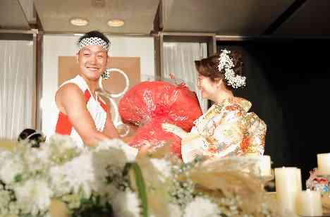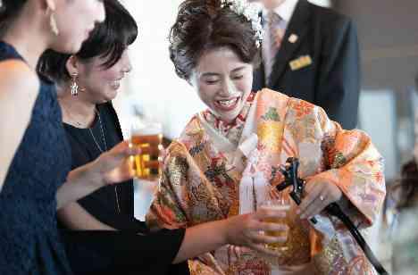 お色直しでは新婦様の明るい性格にぴったりなオレンジの色内掛けにお召し替えをされました。おひとりお一人に感謝の気持ちを伝えながら、「ビールサーバー」でおもてなし。ビールが大好きな新婦様ご自身も楽しまれました。