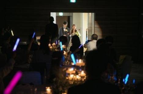再入場はドレスの色当てクイズに因み、ゲストが選んだ色のサイリウムを振って新郎新婦をお出迎えされました。 当選者には、くじ引きでプレゼントを用意され、「ホテル日航大阪でのお食事券」など豪華な景品に、会場内は大盛り上がりとなりました。 新郎様の謝辞では、お二人が好きな「風と星とメビウスの輪」の歌詞の一部に因んで、ゲストの皆様へ心のこもった感謝の気持ちを伝えられました。