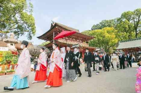 お衣裳は紋付、白無垢で。日本髪風のヘアスタイルを装い、太宰府天満宮にて厳かな神前式を執り行われました。当日は秋晴れにも恵まれ、凛とした神聖な雰囲気の中、日本の歴史を感じる神前式の進行に身も心も引き締まります。ご親族と歩く、花嫁行列は華やかで、残すお写真も格別です。挙式後のお時間には皆さまで写真撮影なども楽しまれ、和やかなお時間も過ごされました。