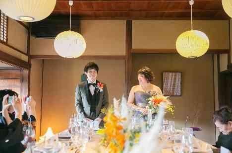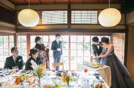 派手な演出をするのではなく、アットホームにお食事と会話を愉しめる空間にと、会場装花もとてもお洒落にセレクトされたおふたり。また、和モダンな会場の雰囲気に合わせて「鯛の塩釜開き」の演出も。本当に近しいご家族だけをお呼びになられたからこそ伝えられる感謝のお手紙など、終始和やかで、笑顔と感動溢れる一日となりました。