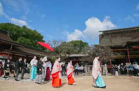 挙式は当ホテルから徒歩1分の「大宰府天満宮」にて執り行うことを決められたおふたり。ご当日は紋付と白無垢に綿帽子姿がとてもお似合いです。ご家族に見守られながら、厳かな雰囲気の中、夫婦としての誓いを結ばれました。また、神前式だからこそ花嫁行列や三々九度など、日本らしさを感じる美しいお写真も沢山残していただき、ご家族での撮影も愉しまれていました。
