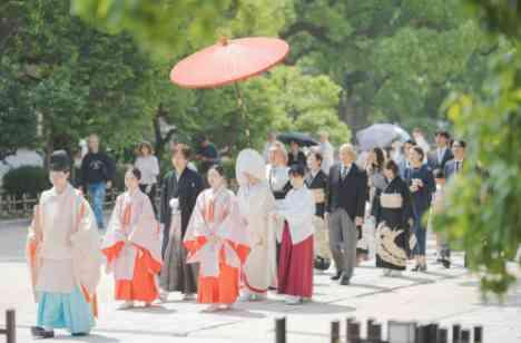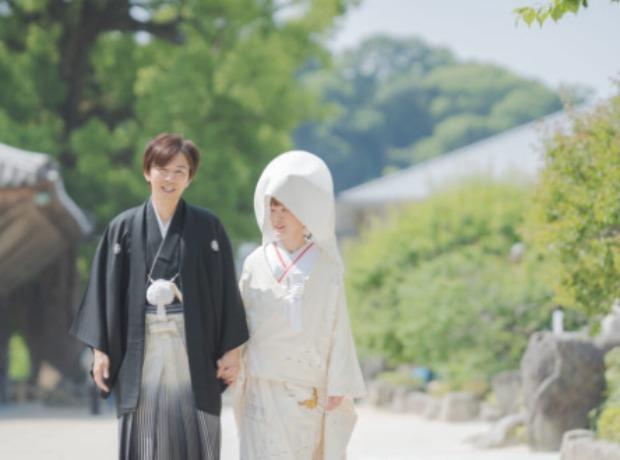 涼しい風が吹き、温かな陽光が差し込む晴天のなか、太宰府天満宮で挙式を執り行われたおふたり。紋付羽織袴の新郎様と、白無垢を纏われた新婦様が、ご家族と一緒に花嫁行列で本殿へと進まれる姿は、まさに日本古来から続く節目の日のお姿です。家族という絆を深く感じられる神前式。ご家族とのお時間をゆっくりと過ごされました。