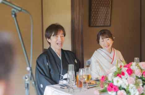 初夏のやわらかな気候にぴったりの気持ちも明るくなるようなフラワーコーディネートでゲストをお迎えされました。ローズやカーネーションといった洋風の花材と、和モダンの会場がマッチし、会場は洗練された上品な印象に。華やかなフラワーコーディネートで彩られたメインテーブルには、多くのゲストの方々に囲まれるおふたりの姿が。写真撮影やご歓談で、大切なゲストの方々とともに、ご披露宴の時間をゆっくりと過ごされました。