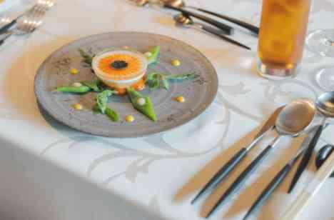 「ホテル カルティア太宰府」では、コース内容が決まっているわけではなく、プリフィックスメニューのコース料理をご用意しております。一品一品、コース料理の内容をおふたりがチョイスしていき、オリジナリティ溢れるメニューを作ることができます。 前菜であるオードブルに選ばれたのは海の幸のジュレ「ひまわり」。花びらはパプリカで一枚一枚つくられている、味だけでなく目でも楽しめるメニューです。