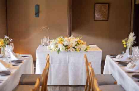 陽光、ゲストの拍手や笑顔。この日は、心温まる空間が象徴するように、おふたりが本当に大切にしたい「感謝」と「交流」にたっぷりと時間を注がれました。 ゲストファーストで準備を進めてやっと迎えた当日、白と黄色を基調としたテーブルコーディネートは、まるでおふたりがゲストを想うその優しさと、当日の多幸感を見事に表しているかのような印象でした。
