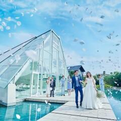 【海の絶景ロケーション】海と青空に囲まれたチャペルで入場体験!開放感を感じるガラス張りの感動のチャペル「ブルービジュー」。小高い丘に佇む天井高13mの木の香りに包まれた森のチャペル「アーリオス」もご紹介